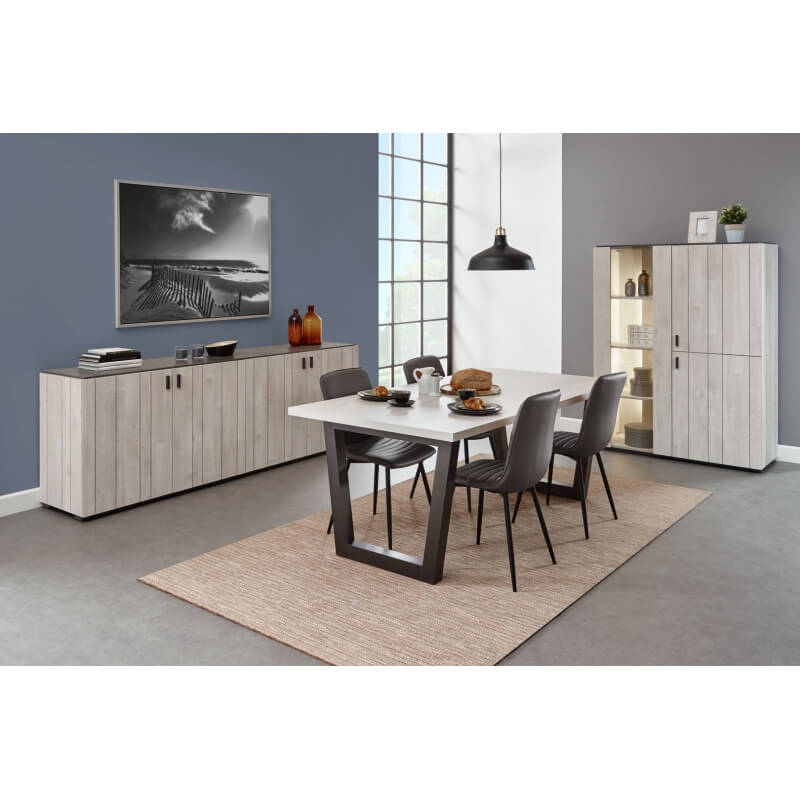 Accueil › sols et murs › sols stratifiés › sols stratifiés décors blanchis › sol stratifié décor chêne blanchi factory silence chêne clair nordique. Sa structure est fabriquée en panneaux alvéolaires 100% mélaminés. La bibliothèque + le buffet 3 portes + la table repas allonge + les 4 chaises.